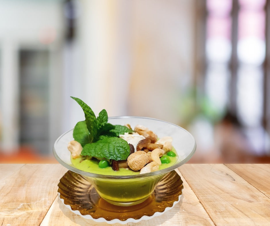 Crema di piselli, piselli a crudo, robiola aromatizzata al limone, funghi e anacardi.
