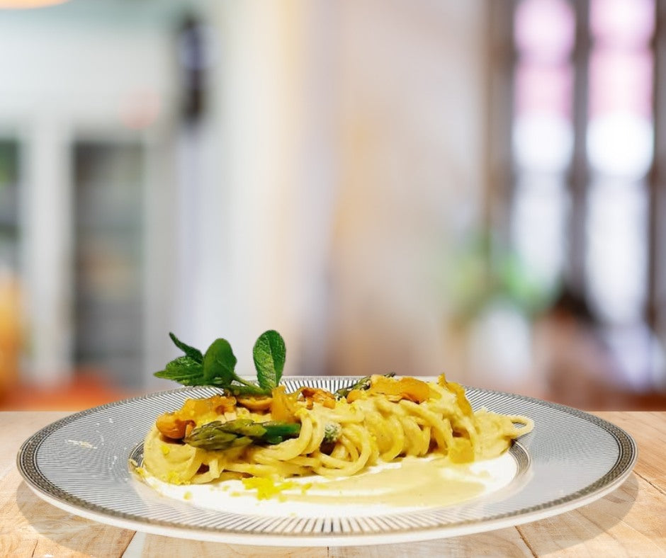 Spaghetti trafilati al bronzo con crema di asparagi e anacardi, granella di anacardi, piccole zeste di limone candito, asparagi a crudo e tuorlo grattugiato.