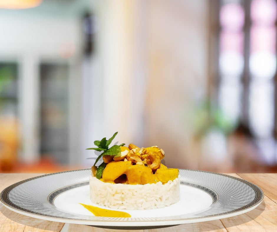Bocconcini di pollo alla curcuma con anacardi e riso basmati.