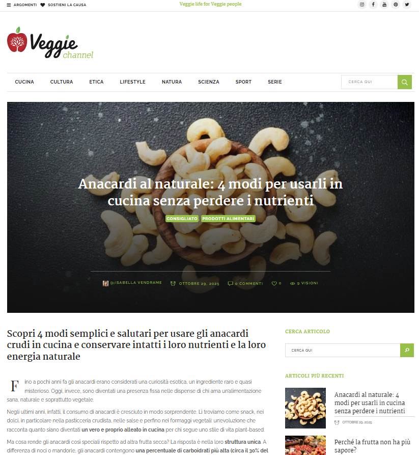 Articoli realizzati da Veggie Channel riguardo ai nostri anacardi.