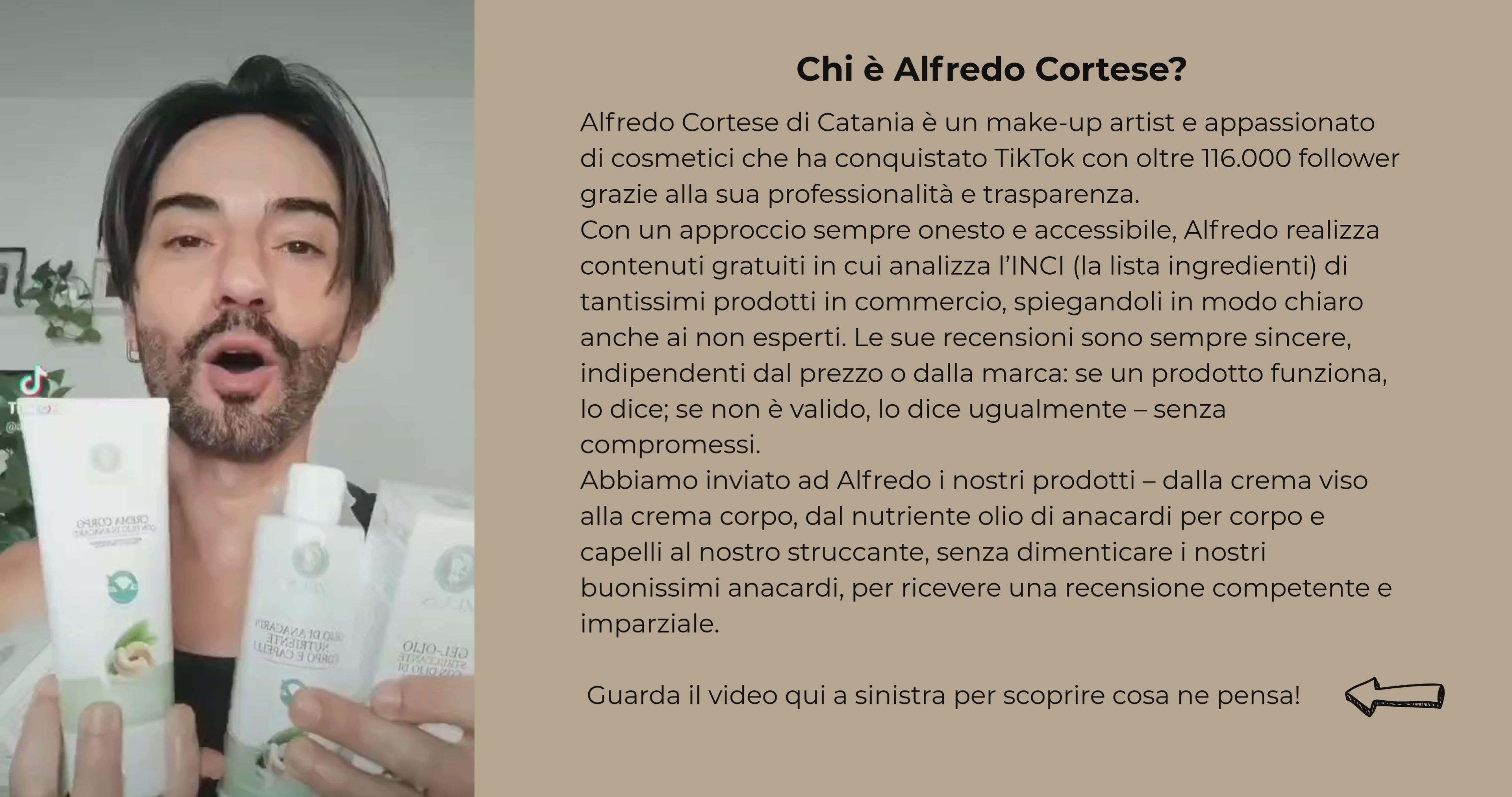 "Ho provato diversi prodotti, non conoscevo bene gli anacardi ed è stata una scoperta, dall'anacardo semplice da snack, alla giardiniera e cipolle in olio anacardi quando organizzo gli aperitivi, i sughi fantastici per la pasta e l'olio che da un sapore incredibile sia a crudo che per cucinare. Inoltre ho trovato un sacco di ricette dove utilizzare gli anacardi e le voglio proprio provare!!! Prodotto e azienda pronta a qualsiasi esigenza che consiglio vivamente!!!"